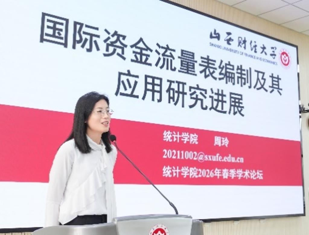 学术报告的第一单元是国民经济核算研究专题。周玲老师作了题为《国际资金流量表编制及其应用研究进展》的报告。她指出,地缘政治风险加剧、新型贸易形式涌现等因素使得国际资金流动呈现出新的变化。基于此,研究构建了全球多边资金核算框架,编制了连续年份资金流量表,并配套设计了一套国际资金流量分析方法体系。此外,她还详细梳理并介绍了国际资金流动领域未来潜在的研究方向与重点问题,为到会的研究生提供了高质量的选题建议。
