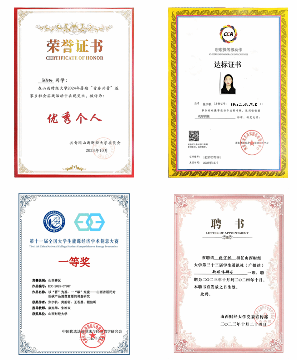 张宇帆,中共党员,7790必发集团游戏2022经济统计学专业学生,担任班级生活委员。在校期间,学习成绩良好,荣获校长奖学金、多次校级一等奖学金,曾担任学生通讯社(广播站)新媒体部部长,并被授予三好学生标兵、三好学生、优秀共青团干部、优秀学生干部、优秀通讯员等称号。同时,作为调查员参与介休市第五次经济普查试点调查工作和山西知识产权社会满意度调查项目,连续四次参加“青春兴晋”返家乡社会实践,累计获得志愿时长700+小时。此外,以队长、核心成员身份参加多项省级、国家级竞赛,累计获得国家级奖项2项、省级奖项6项,最终被推免到东北大学理学院。