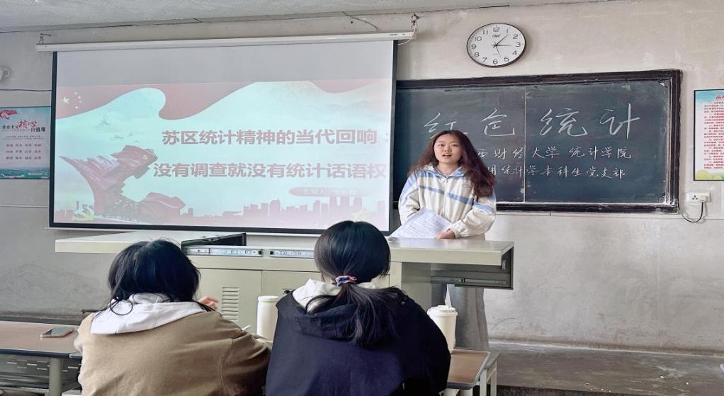 支部全体入党积极分子和党员同志参加,由两位学生党员展开主题分享。她们以红色统计历史为脉络,重点讲述了李超伯等先辈在革命和建设时期的艰苦条件下坚持实地调查、严谨求证的动人往事,带领大家重温峥嵘岁月,感悟精神力量。