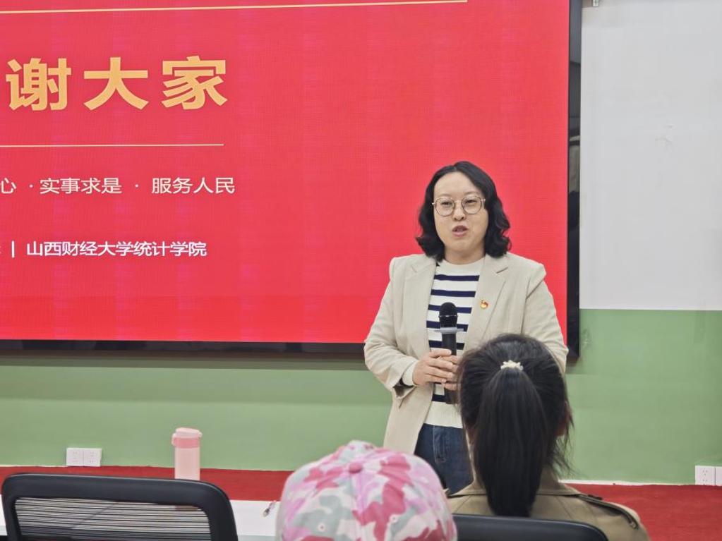 数据科学系党支部书记张晓琴教授结合专业建设与红色史料研究作交流分享,详细介绍革命根据地统计教育的起源与发展,回顾早期统计教材编写的历史背景与实践价值,鼓励同学们立足山西红色资源,主动挖掘太行革命根据地等地的统计历史故事,将专业学习与红色文化传承紧密结合,在数据可视化、统计图形设计、AI与统计融合等方向勇于探索,把论文写在祖国大地上。