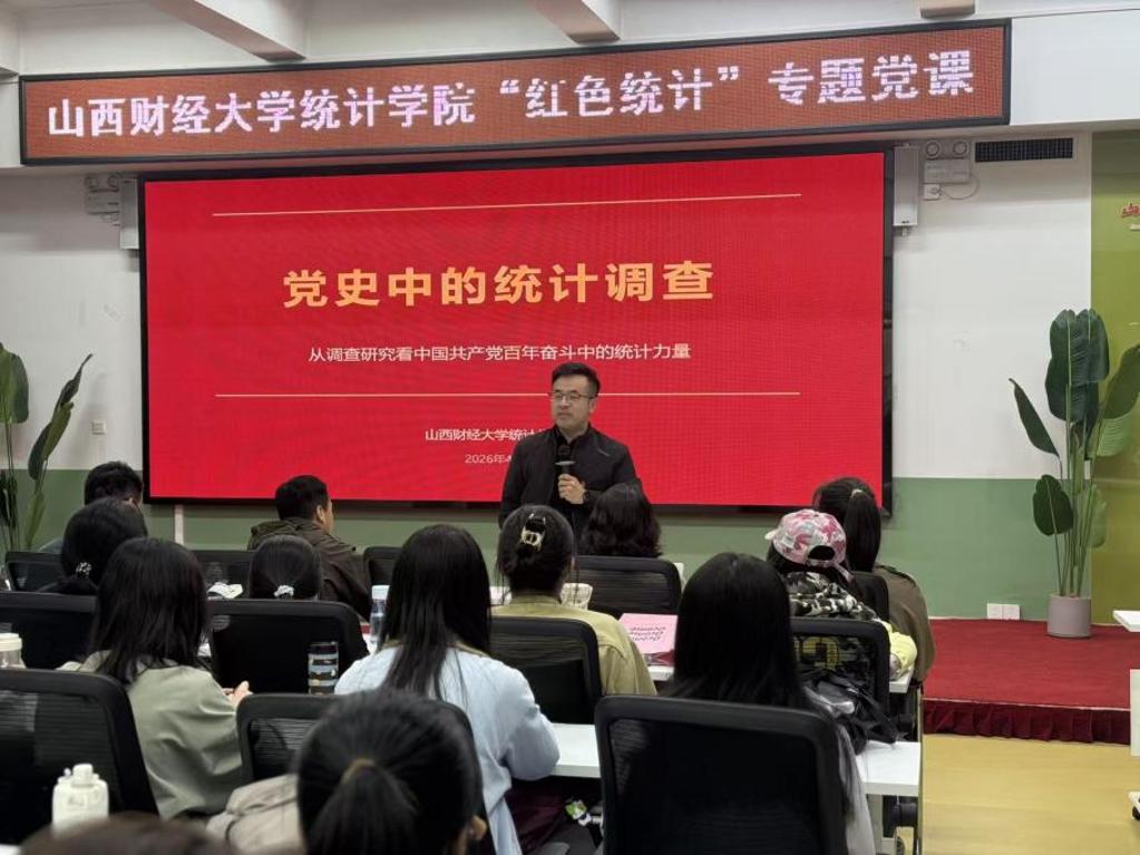 王峰教授围绕党史中的统计调查工作作专题辅导,重点解读毛泽东同志“没有调查,没有发言权”“不做正确的调查同样没有发言权”的经典论断,深刻阐释调查研究作为党的传家宝,贯穿新民主主义革命时期、社会主义革命和建设时期、改革开放和社会主义现代化建设新时期、中国特色社会主义新时代各个时期的重要意义。他系统回顾了从中华苏维埃共和国调查统计局在瑞金诞生,到中央苏区开展土地、人口、工商业调查;从太行抗日根据地创办《调查研究》刊物,到华北解放区编写第一本统计教材《实用统计方法》;从新中国成立后统计体系逐步建立完善,到新时代运用大数据、人工智能推动统计创新发展的光辉历程,让全体同学深刻认识到,统计调查工作始终与党的事业同频共振、同向而行,是科学决策的重要基础,是密切联系群众的重要途径。