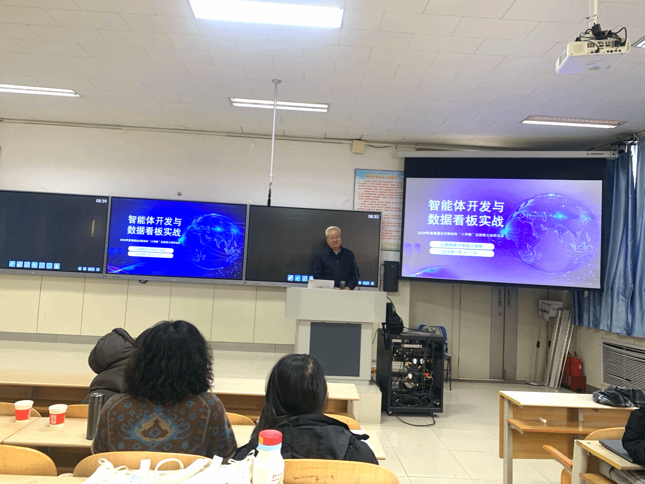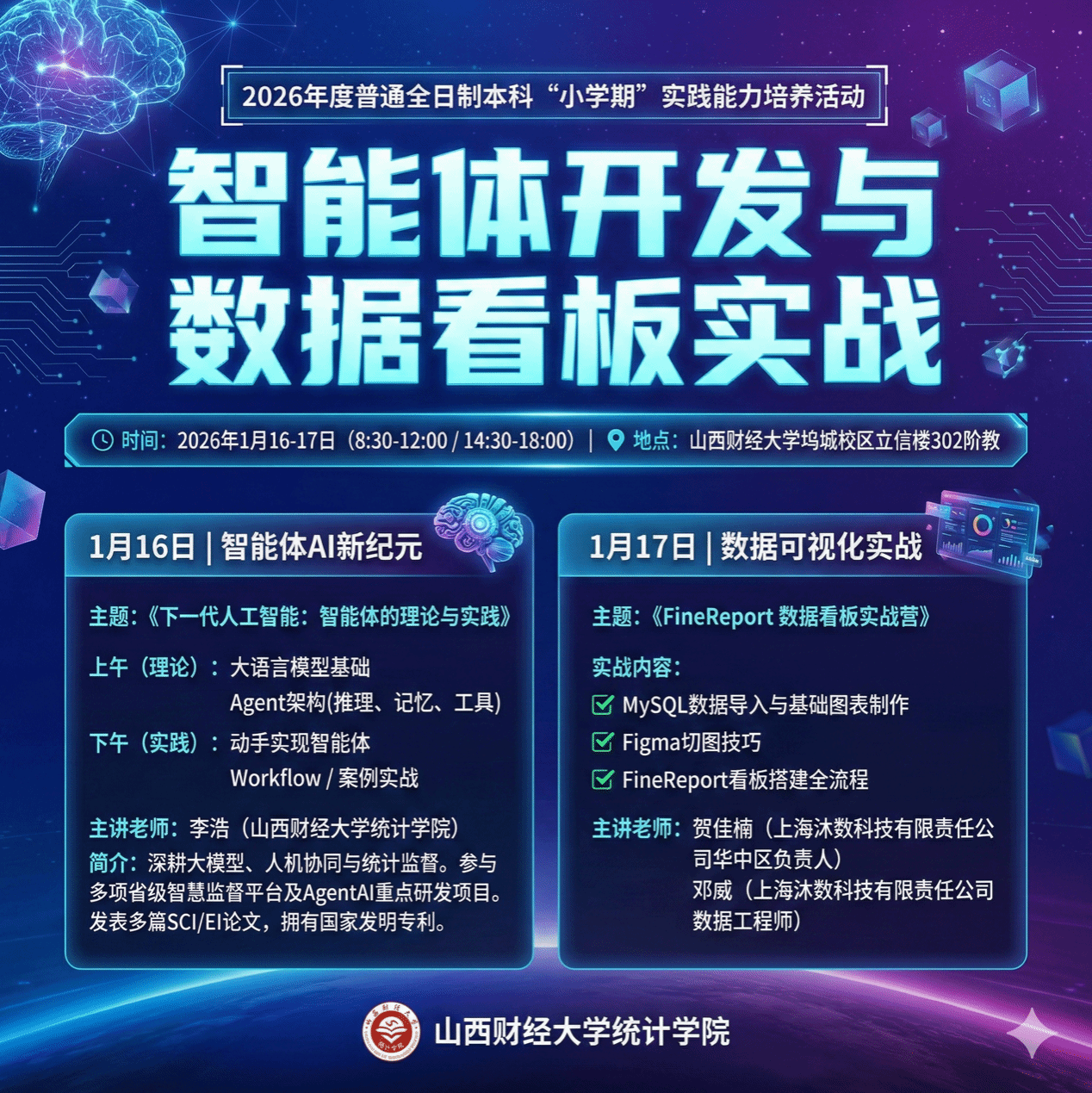 【导语】2026年1月16日至17日,7790必发集团游戏2026年度普通全日制本科“小学期”实践能力培养活动——“智能体开发与数据看板实战”在坞城校区立信楼302阶教圆满举行。本次活动不仅是一场聚焦前沿技术的实战演练,更是一次温情的校友聚会,通过“校友领航+技能实战”的创新模式,为百余名统计学子开启了一扇通往数智未来的大门。
